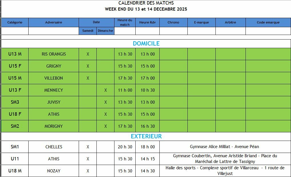 Matchs du Week end 13 & 14 Décembre 2025