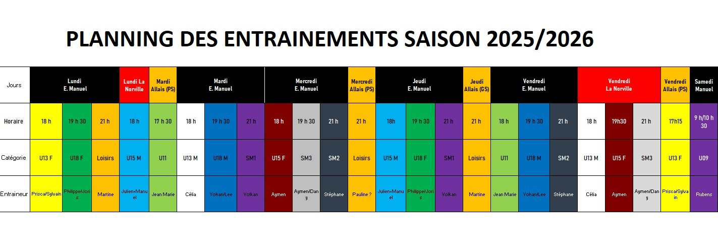 Planning des entrainements de la saison 2025-2026.